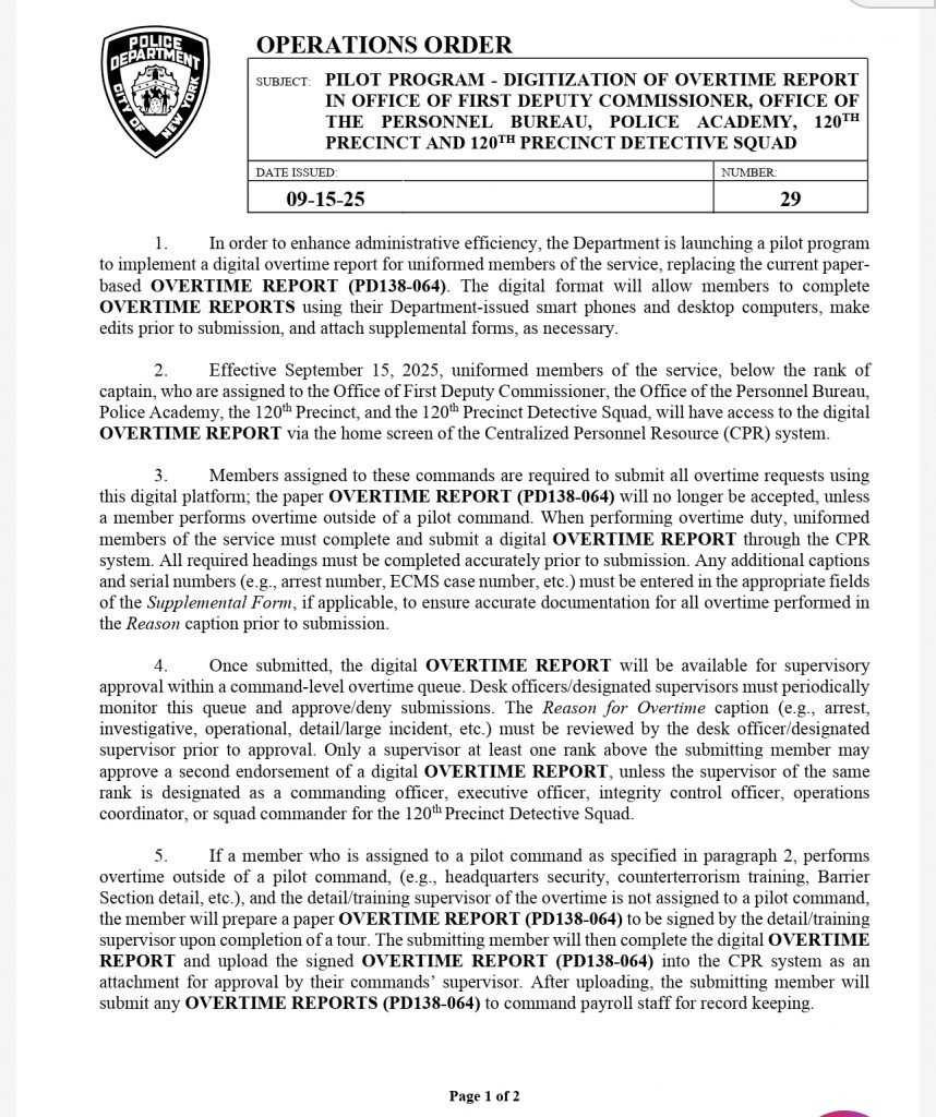 The NYPD has announced a pilot program to digitize its overtime reporting system. The initiative replaces the traditional paper-based Overtime Report (PD138-064) with a fully digital format, designed to streamline administrative efficiency and ensure faster, more accurate processing of overtime claims.