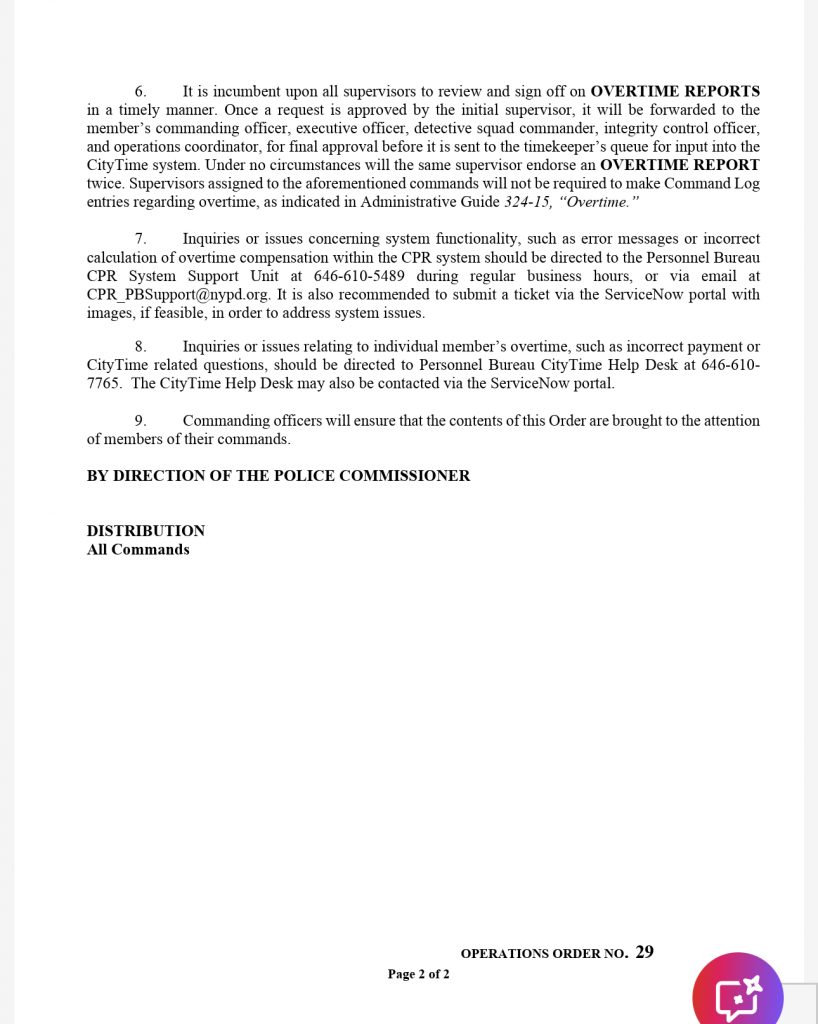 - Only a supervisor at least one rank above the submitting member may approve a second endorsement of a digital overtime report unless signed by a commanding officer, executive officer, integrity control officer, or squad commander for the 120th Precinct Detective Squad.